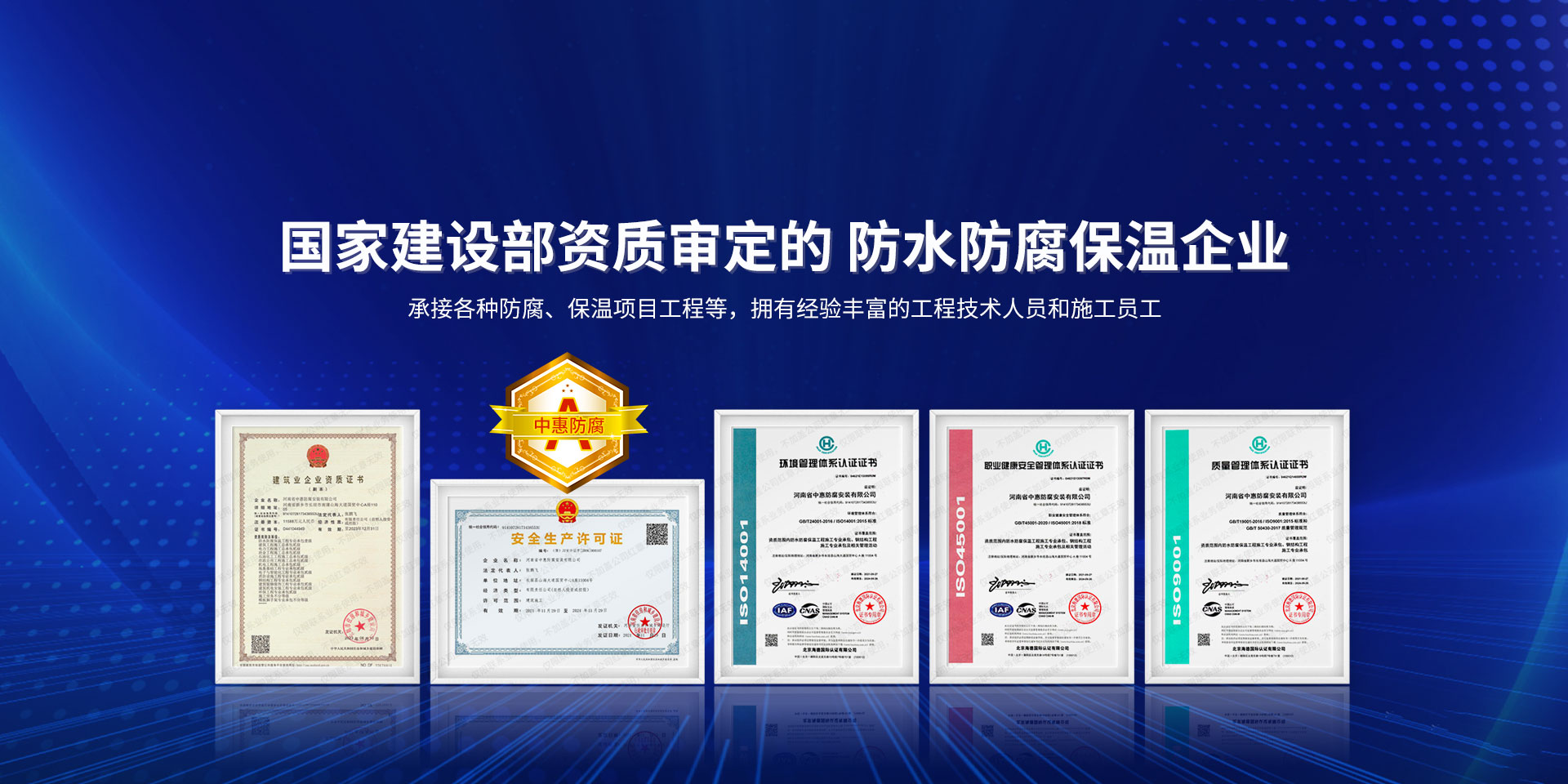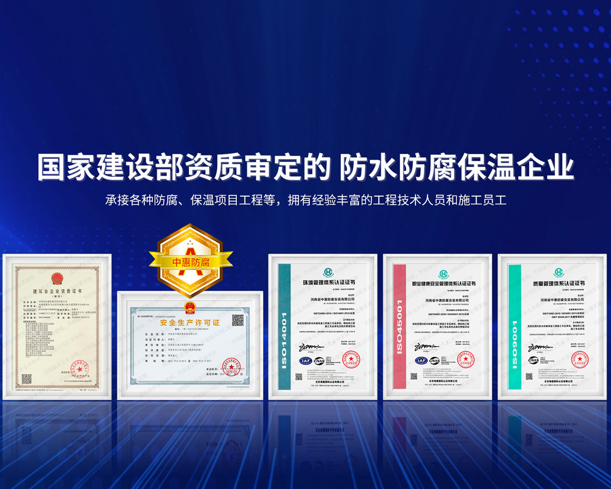 公司經營范圍:防水防腐保溫工程;消防設施工程;建筑裝修裝飾工程;建筑機電安裝工程;電力工程;建筑工程;石油化工工程;工業清洗工程;油罐清洗工程;鋼結構工程;環保工程;模板腳手架工程;電纜防火封堵、防污閃噴涂、外墻外保溫工程;各類施工勞務作業;設備維修、船舶鉚焊、涂裝;電力工程材料、建材、防水材料、防火材料、防腐保溫材料銷售,并相繼通過了GB/T19001-2008idtISO9001:2008GB/T50430-2007質量管理體系認證證書。GB/T24001-2004idtISO14001:2004環境管理體系認證證書。GB/T28001-2011idtOHSAS18001:2007職業健康安全管理體系認證證書。公司是中國防腐蝕于防護協會、中國施工企業管理協會、電力協會和中國鋼結構防水協會會員單位。 公司的經營業務涵蓋了石油、化工、電力、冶金、煤炭、船舶、國防、燃氣、水利、環保、交通運輸、航空及國防軍工和輕紡市政等行業的防腐保溫絕熱設備。鋼結構安裝、防火、防水、金屬噴鍍、聚脲噴繪、陰極保護、防滲透堵漏、玻璃鋼及各種磚版材料襯里、橡膠襯里、煙氣硫和耐酸溶劑腐蝕等工程施工。公司連續十年榮獲“省市先進施工企業”“安全生產先進單位”“重合同,守信用企業”和“AA***資質企業”的稱號。2000年被命名為市級文明單位,2002年被國家工商行政管理局命名為“重合同,守信用的企業”、被中國工業防腐蝕技術協會命名為“防腐蝕企業,能源節約及環境保護領域有豐富的經驗和***的業績。工程一次交驗合格率100%。其中攀枝花鋼鐵公司煉鐵廠四號高爐及熱風爐防腐工程、上海寶鋼公司煤氣柜防腐工程、撫順石油一廠裝置防腐項目、齊魯石化公司稀烴廠高塔防腐工程、吉林化學工業公司煉油廠油罐防腐工程、天津石化熱電廠六號爐頂棚聯絡管保溫工程、大慶油田(太倉)力神泵業工程、中國化學工程第十一建設工程、中原油田勘探局工程、中國石化銷售有限公司華北分部、魯皖輸油管道工程、貴州開磷息烽合成氨工程、陜西黃陵煤化工程、中國石油天然氣西部管道塔里木輸油工程、邯鋼集團邯寶鋼鐵公司煉鐵工程、德州供電工程、吉寶(南通)船廠工程,偃師華潤熱力工程、鄭州熱力總公司。 河南省中惠防腐安裝有限公司愿以豐富的施工經驗,***的技術,***的設備,***的管理,***的服務,竭誠為國內外廣大的用戶提供***滿意、******的工程作品。 我公司愿與國內外同仁一道,團結協作,共同推進防腐蝕行業發展! 公司地址:河南省長垣縣建設路北段360號 固定電話:0373-8866488 郵編:453400 網址:http://www_zhff_com_cn.qitengxing.com